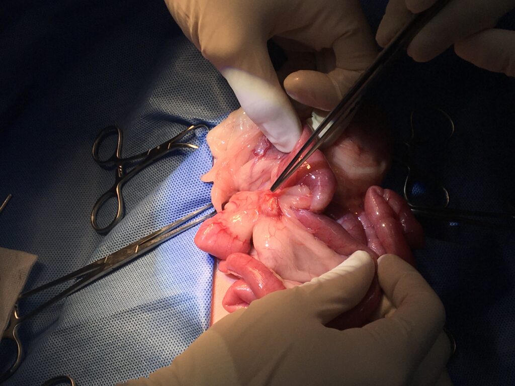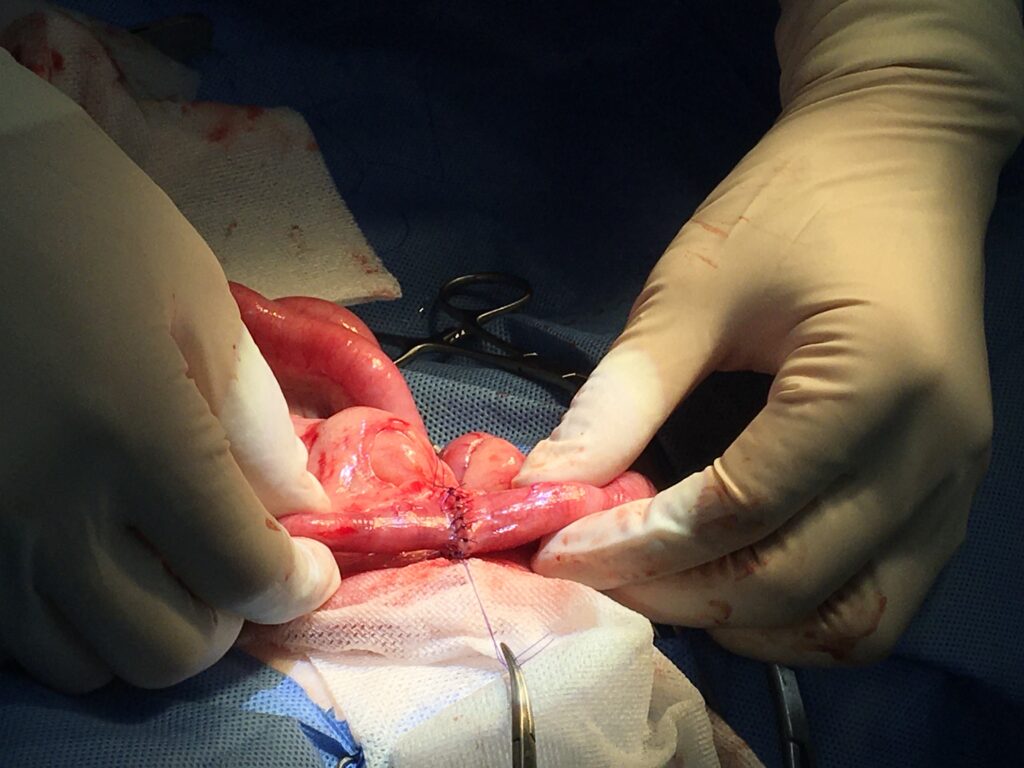 ・回盲部領域において、漿膜の一部が白色の変色している箇所を確認、近傍の回盲部リンパ節の腫大を確認、その領域を摘出し、腸管を端々吻合