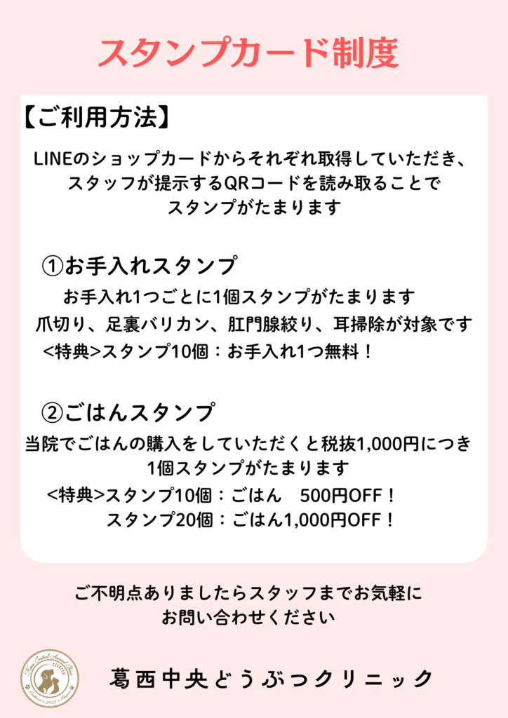 2026.02.20 【通うほどお得になるラインスタンプカード💳】 葛西中央どうぶつクリニックでは、ラインショップカードによるスタンプ制度を開始しました! 来院、ご購入ごとにスタンプが貯まり、お手入れやフードが割引になります ご不明点あれば、お気軽にお電話ください 一覧に戻る